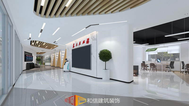 辦事大廳黑白空間碰撞,大面積窗戶將外面的自然景觀引入,給人以清新的感覺,簡(jiǎn)潔、醒目,休閑區(qū)巧妙地將空間分為兩個(gè)功能區(qū),流線展示合理引導(dǎo)觀眾路線,讓人感受空間變化的魅力。