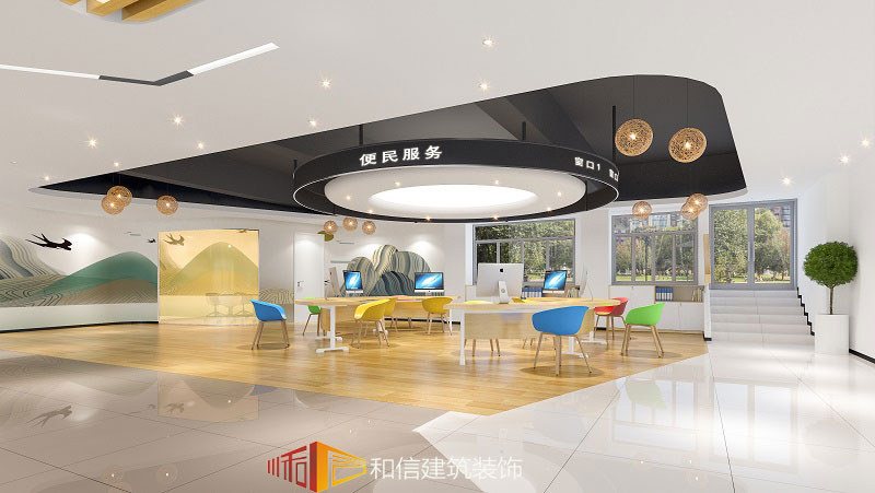 便民服務(wù)中心整個(gè)空間以暖色調(diào)為主,營造一種具有開放性、親民性、視覺性的特色空間格局,原木地板紅、藍(lán)、綠等亮色想碰撞,配以鏤空造型的燈具,營造出明亮的空間氛圍,同時(shí)也豐富了空間的層次感。