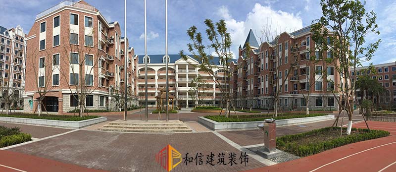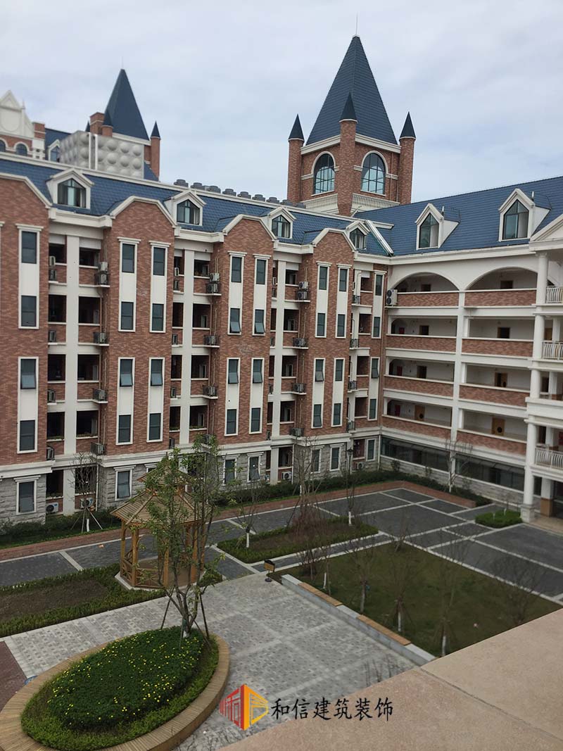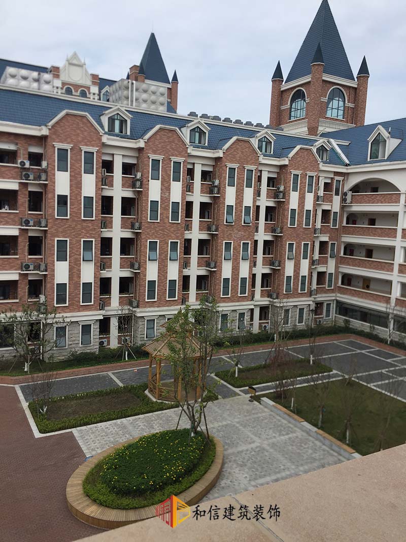 學(xué)校裝修外觀為古典城堡建筑風(fēng)格,錯(cuò)落有致,色調(diào)搭配和諧、穩(wěn)重的同時(shí)冷暖色系比例合適,給人一種積極向上的觀感。室內(nèi)延續(xù)了建筑的色彩搭配,古典精致的吊燈安排在學(xué)生宿舍走廊,希望帶給學(xué)生一種溫暖的歸屬感。